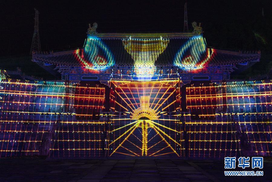 这是9月14日晚在湖北省武当山玉虚宫景区拍摄的光影秀。 大规模光影秀“玄岳之光”于近日在武当山玉虚宫开幕,古老的建筑与现代的声光电科技融合在一起,惊艳夜空。位于湖北省武当山景区的玉虚宫是武当山建筑群中最大的宫殿之一,始建于明永乐年间,规制谨严,院落重重。 新华社记者 杜华举 摄