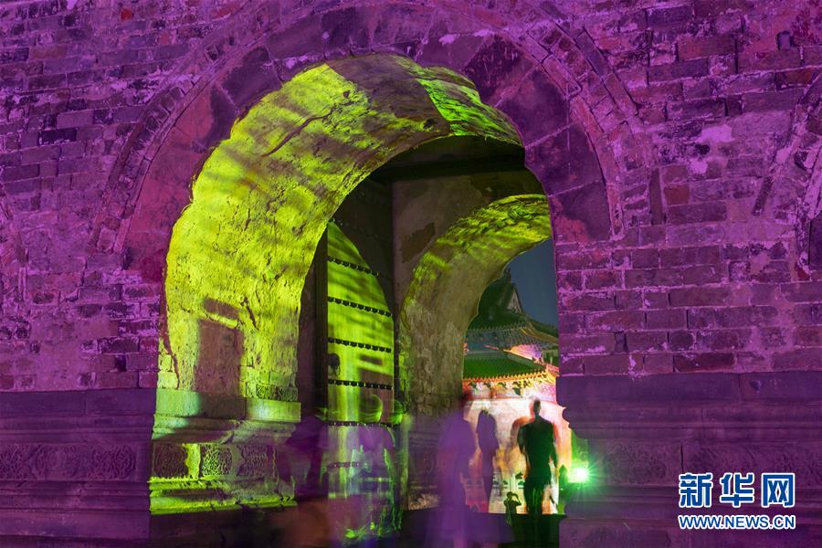 9月14日晚,游客在湖北武当山玉虚宫景区观赏光影秀。 大规模光影秀“玄岳之光”于近日在武当山玉虚宫开幕,古老的建筑与现代的声光电科技融合在一起,惊艳夜空。位于湖北省武当山景区的玉虚宫是武当山建筑群中最大的宫殿之一,始建于明永乐年间,规制谨严,院落重重。 新华社记者 杜华举 摄