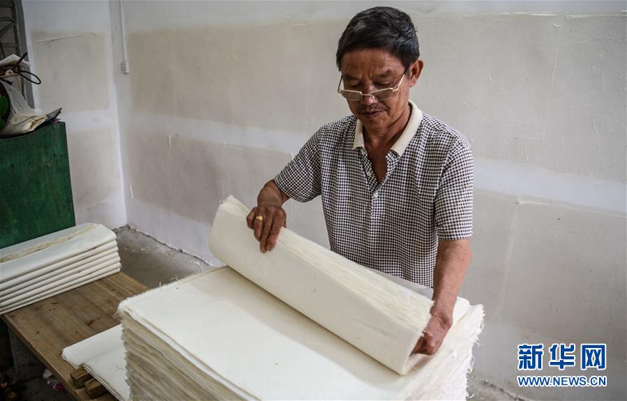 9月19日,广西大化瑶族自治县贡川乡贡川村村民在整理晾晒好的贡川纱纸。 广西大化瑶族自治县贡川乡贡川村群众保留着传统民间造纸工艺,以山区特有的构树皮、植物胶等为原料,加工制作贡川纱纸。 贡川纱纸因具有较高的韧性、吸水吸湿性、透气性等特点,远销港澳台及东南亚、欧洲、非洲等地区,其制作工艺在2007年入选广西壮族自治区非物质文化遗产名录。 新华社记者 张爱林 摄