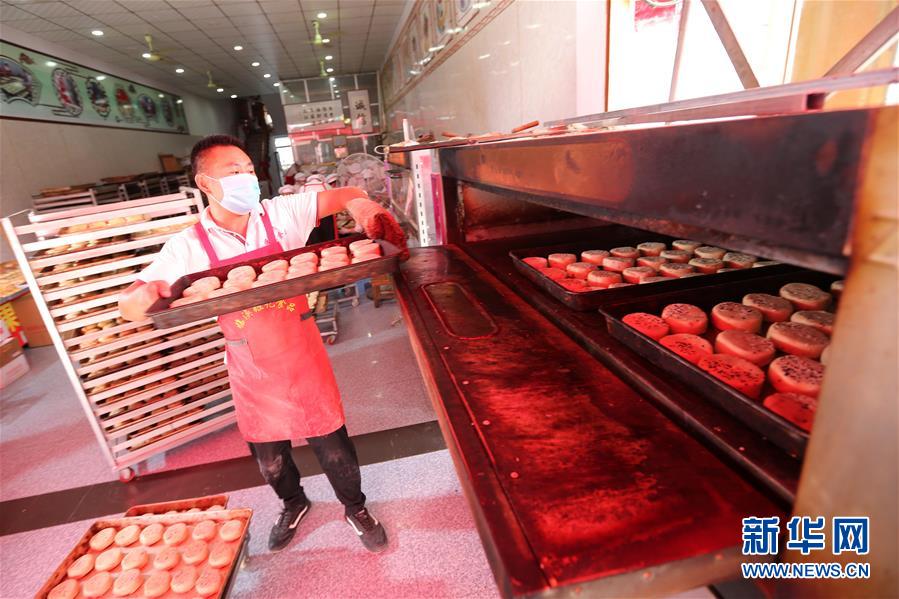9月21日,在濉溪县临涣镇,工人在烘焙香油月饼。 临近中秋佳节,安徽省淮北市濉溪县临涣古镇传统手工制作的香油月饼进入旺销季,凝聚着手工艺人匠心味道的香油月饼借助电商等渠道俏销各地。临涣镇是一个千年古镇,当地手工制作香油月饼历史悠久。月饼的馅料以花生、芝麻、瓜子、青红丝、香油、白砂糖等为主,通过多道工序加工烘焙而成。 新华社发(万善朝 摄)