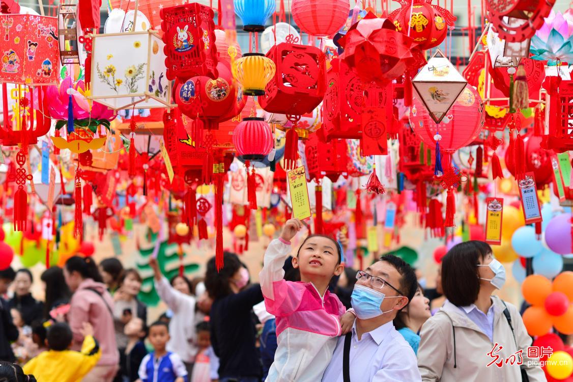 2020年9月28日,内蒙古呼和浩特市赛罕区敕勒川绿地小学"校园灯会迎佳节"主题活动启幕。全校3000余名学生、教师和家长将在赏花灯、猜灯谜、制月饼等系列活动中体验中秋节传统文化。(王正摄/光明图片)