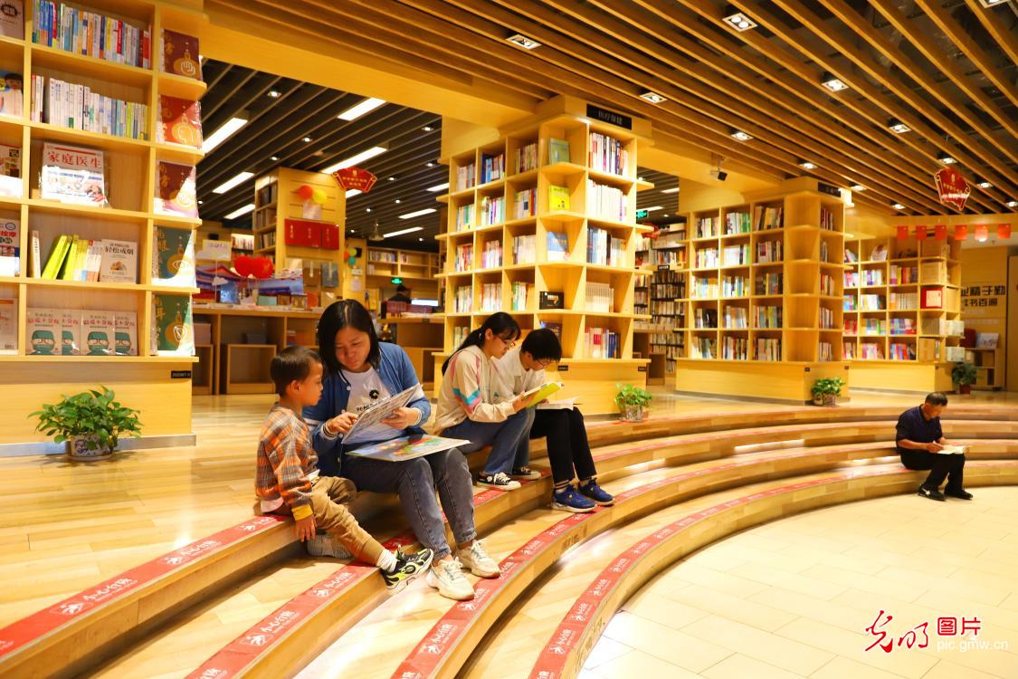 2020年10月1日,市民在江西省新余市渝水区城南新华书店内阅读。中秋、国庆长假期间,许多人选择走进书店,让书香伴随自己度过假期。(廖海金摄/光明图片)