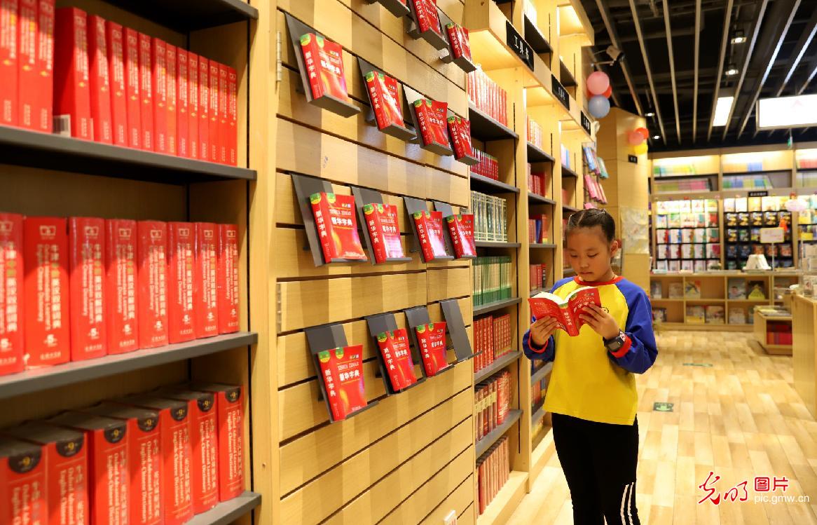 2020年10月1日,小朋友在江西省新余市渝水区城南新华书店内阅读。中秋、国庆长假期间,许多人选择走进书店,让书香伴随自己度过假期。(廖海金摄/光明图片)
