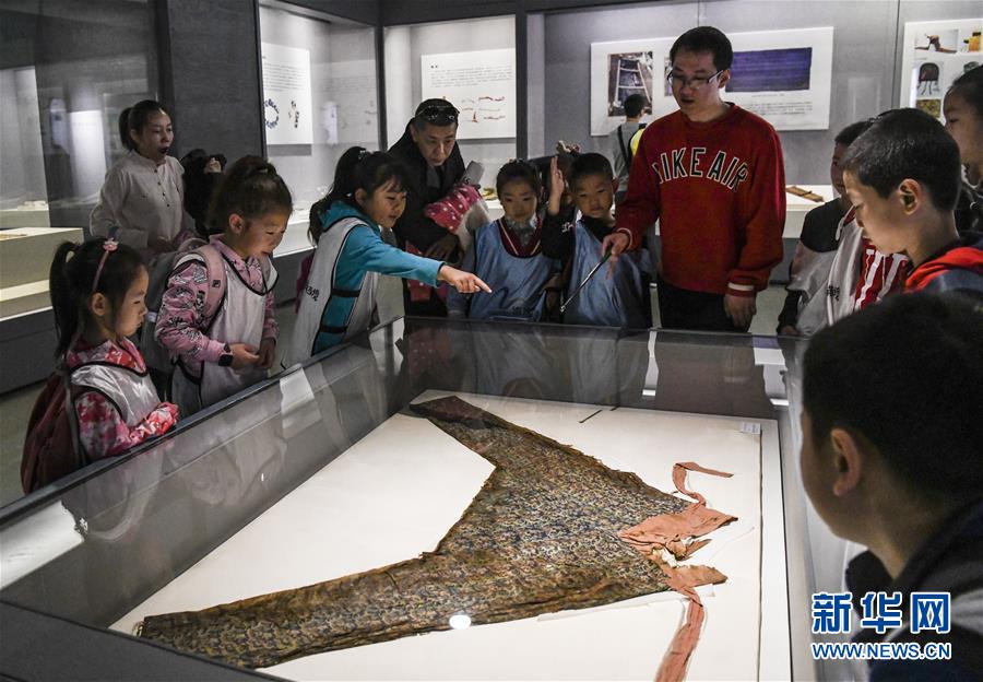 在位于乌鲁木齐的新疆博物馆,参观者在观看“长乐大明光”锦女裤(2019年5月18日摄)。新华社记者 王菲 摄