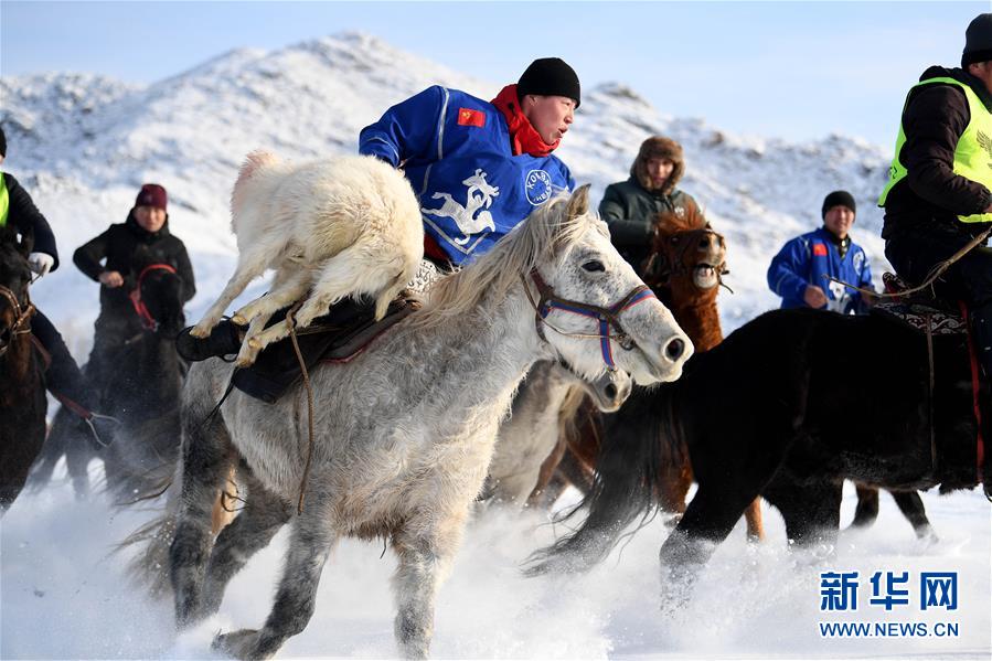 人们在阿勒泰市赛马场参加新疆阿勒泰市2020年迎新春雪都赛马大会叼羊比赛(2020年1月2日摄)。新华社记者 沙达提 摄