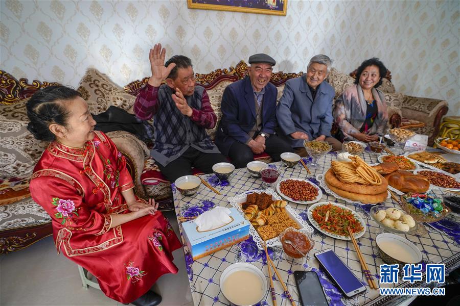 在新疆塔城市哈尔墩社区的一处小院里,维吾尔族居民沙勒克江·依明(左二)在家中和街坊邻居交流聊天(4月2日摄)。新华社记者 赵戈 摄