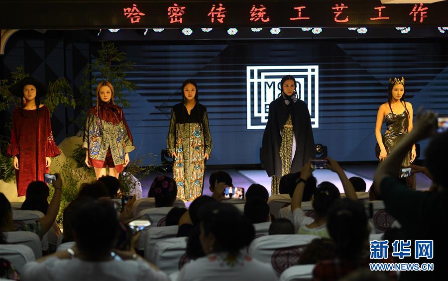 在新疆哈密传统工艺工作站,模特在展示融合了哈密传统刺绣的时装设计作品(2019年6月28日摄)。新华社记者 王菲 摄
