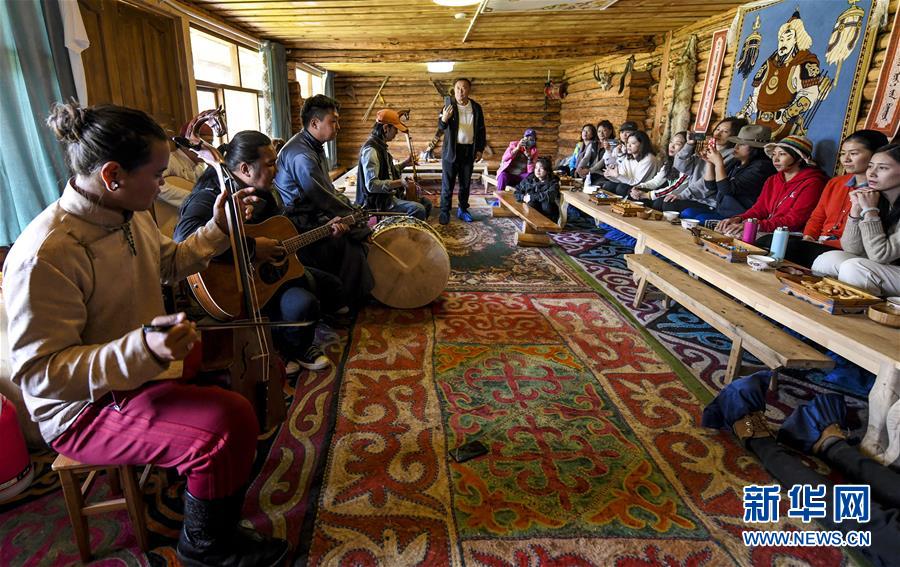 在位于新疆喀纳斯景区的一家民宿内,汗德尕乐队成员为游客演唱(2019年9月24日摄)。由几名“90后”蒙古族青年组成的汗德尕乐队,每年旅游旺季在景区为游客表演,淡季时乐队成员便在全国巡回演出。乐队曲目多为蒙古族民歌,但奏唱方式除了马头琴、羊皮鼓等传统乐器之外,增加了吉他和电音混响。新华社记者 王菲 摄