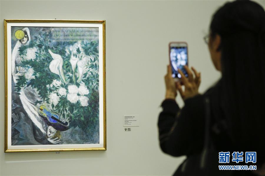 10月10日,参观者在马克·夏加尔中国首展上观展。 从10月9日起,马克·夏加尔中国首展在中央美术学院美术馆廊坊馆开始展出,展览共展出155件作品,涵盖油画、水彩画、水粉画、坦培拉、蚀刻版画等艺术形式。展览横跨1925年到1981年将近60年的时空,展现艺术家贯穿其一生的永恒主题——爱、乡愁以及深植于民族特色的信仰。展览将持续至2021年1月18日。 马克·夏加尔是白俄罗斯裔法国画家、版画家和设计师。他历经立体派、超现实主义等现代艺术流派的实践与洗礼,发展出独特的个人绘画风格,在现代绘画史上占有重要的地位。 新华社记者 张玉薇 摄