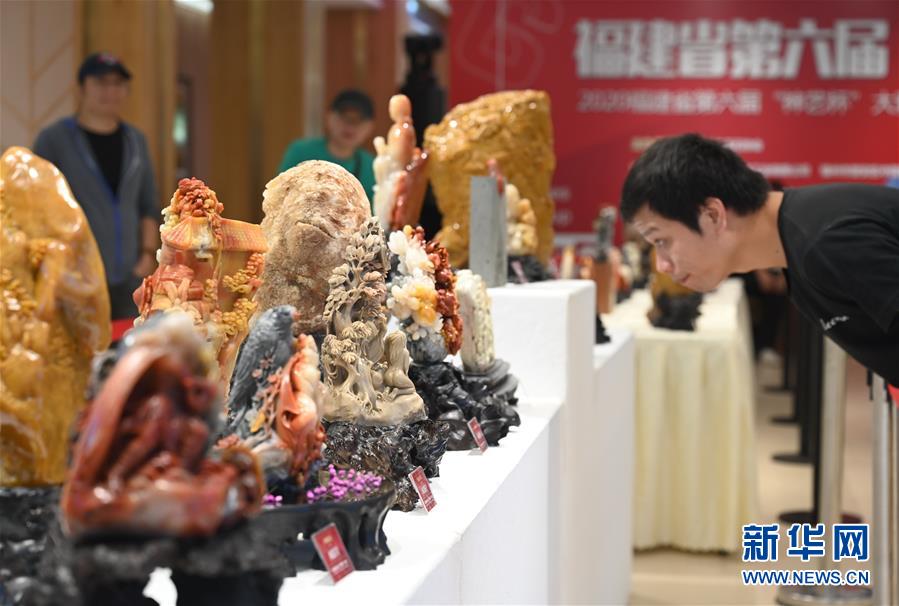 10月11日,观众在福建省第六届“神艺杯”大赛作品展览现场参观。 当日,福建省第六届“神艺杯”大赛暨中国“天工奖”入围作品征集展在福建省工艺美术大楼举行,展出作品涵盖寿山石雕、玉雕、印石篆刻等多个类目。 新华社记者 林善传 摄