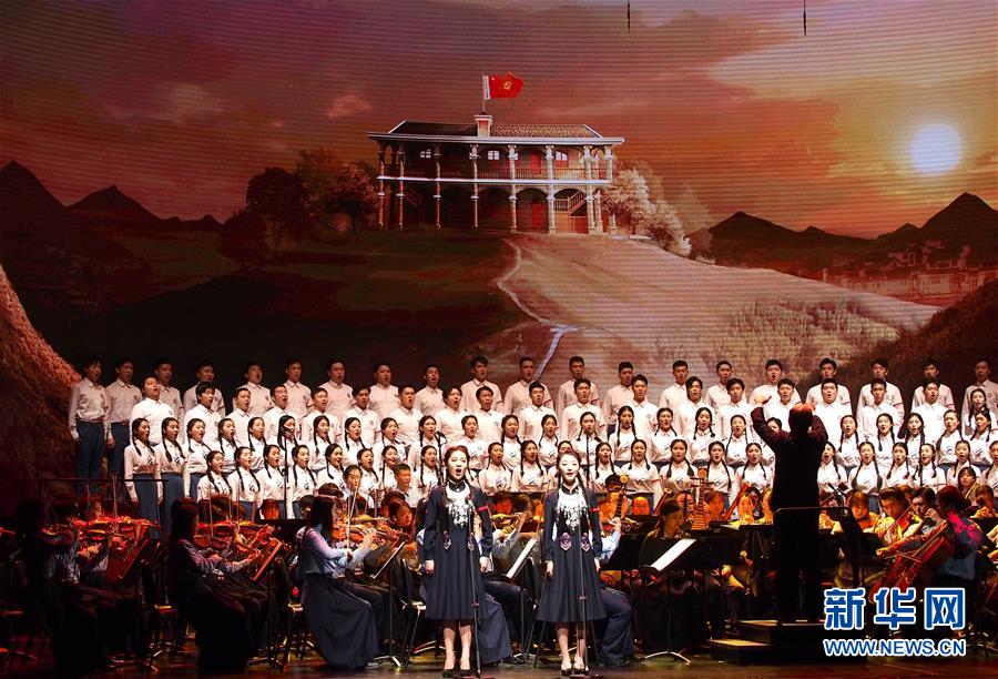 10月15日,上海音乐学院师生在上音歌剧院演出《长征组歌》。 当日,上海音乐学院复排《长征组歌》在上音歌剧院首演,当晚的“青春版”的演出由上海音乐学院师生担纲演出。大型声乐套曲《长征组歌》在1965年首次公演,是我国音乐界的红色经典之一,2020年是《长征组歌》首演55周年。 新华社记者 任珑 摄