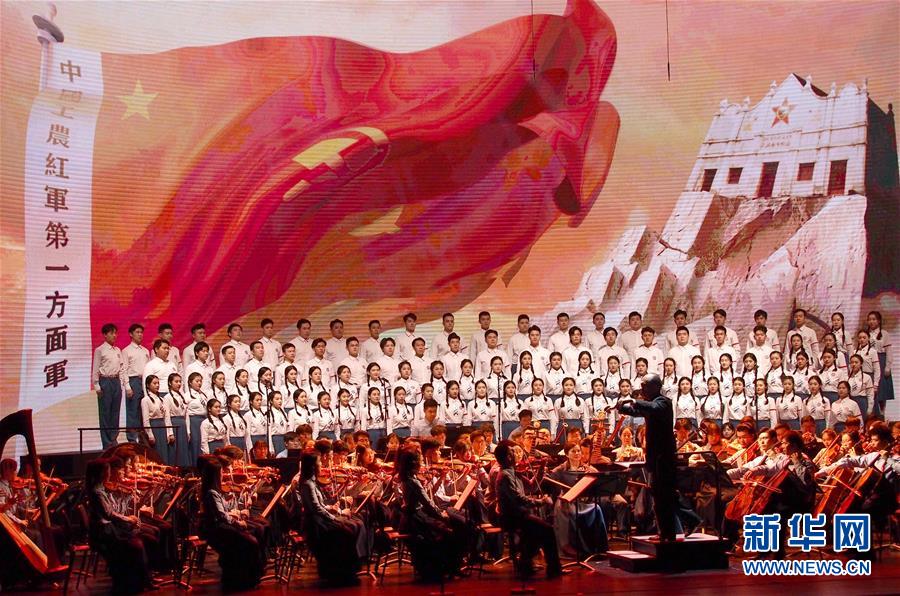 10月15日,上海音乐学院师生在上音歌剧院演出《长征组歌》。 当日,上海音乐学院复排《长征组歌》在上音歌剧院首演,当晚的“青春版”的演出由上海音乐学院师生担纲演出。大型声乐套曲《长征组歌》在1965年首次公演,是我国音乐界的红色经典之一,2020年是《长征组歌》首演55周年。 新华社记者 任珑 摄