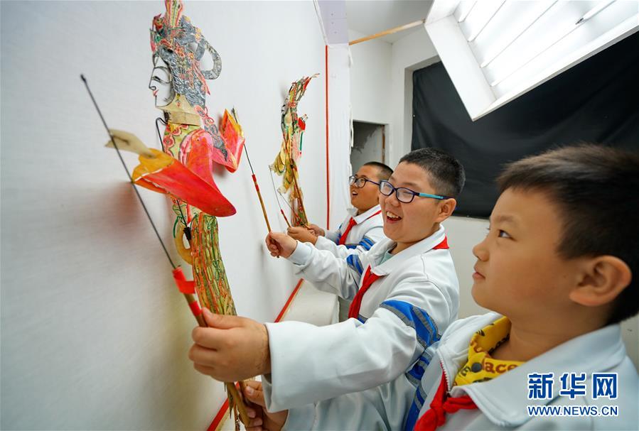 10月19日,小学生们在中国滦州皮影博物馆内练习皮影人操作。 今年以来,河北省滦州市横渠实验小学成立皮影兴趣社团,在当地的中国滦州皮影博物馆开设校外课堂,组织学生定期参观、学习,增强学生对传统文化的了解。 新华社记者 牟宇 摄
