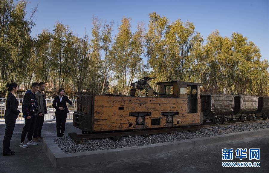 10月19日,游客在中能文创园区参观关中老煤矿区的运煤电机车。