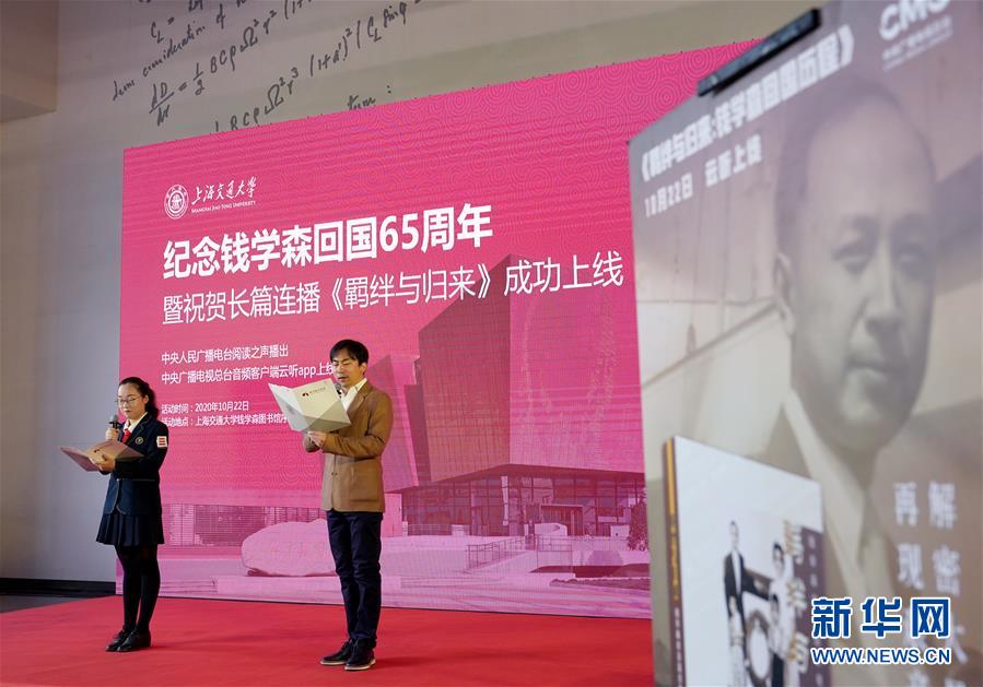 10月22日,活动现场在表演诗朗诵《太阳丛林——献给人民科学家钱学森》。 当日,由中央广播电视总台与上海交通大学钱学森图书馆联合主办的“纪念钱学森回国65周年暨祝贺长篇连播《羁绊与归来》成功上线”活动在钱学森图书馆举行。长篇纪实文学连播《羁绊与归来》讲述了钱学森当年艰难曲折的回国历程和感人故事,听众可通过电台和音频客户端收听,感受老一代科学家的爱国之情与报国之志。 新华社记者 刘颖 摄