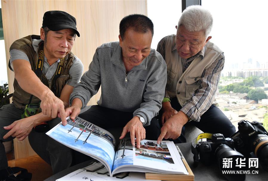 10月27日,在福州东百大楼古厝观光拍摄景点,林振寿(中)与摄友们研究探讨三坊七巷古厝的拍摄角度。新华社记者 魏培全 摄