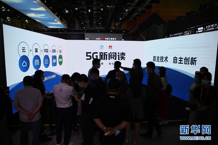 观众在服贸会综合展区中图集团“5G新阅读”展台参观。该展台运用裸眼大屏和移动VR两种形式,将传统2D出版物升级为3D全景出版内容,使读者获得沉浸式阅读体验(9月8日摄)。 新华社记者 潘思危 摄