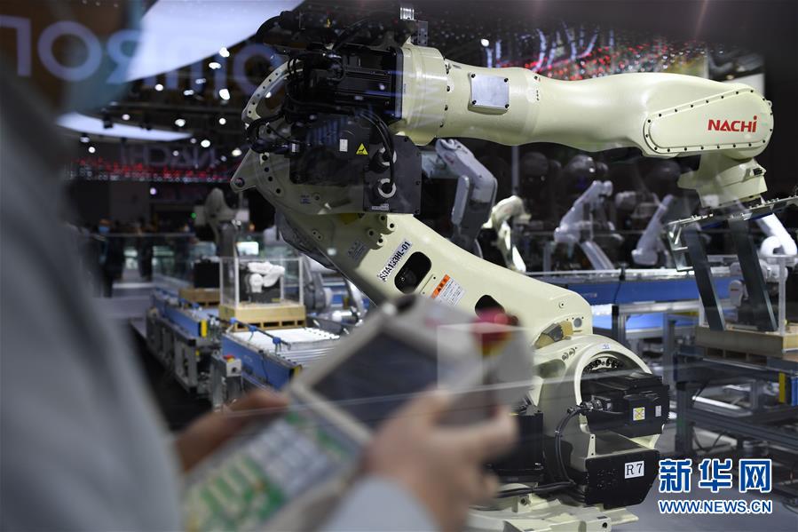 11月5日,在进博会技术装备展区,工作人员操作NACHI工业机器人。新华社记者 李任滋 摄