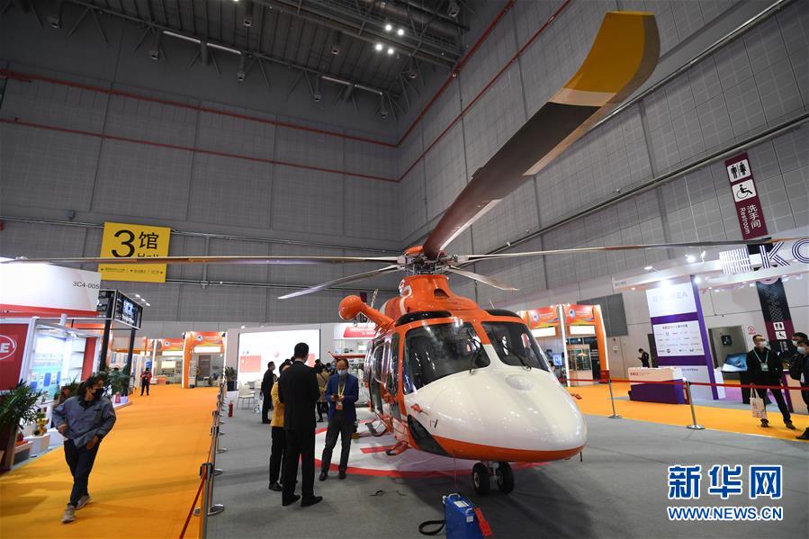 这是11月5日在进博会技术装备展区拍摄的意大利莱昂纳多AW139直升机。新华社记者 李任滋 摄