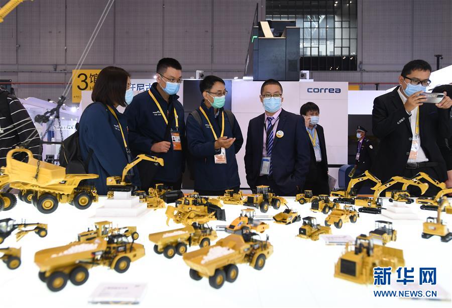 11月5日,在进博会技术装备展区卡特彼勒展台,参展商在介绍工程机械等展品。新华社记者 李任滋 摄