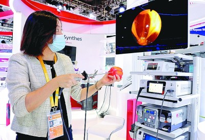 进博会医疗器械及医药保健展区强生展台,工作人员借助工具演示关节镜成像系统。新华社发