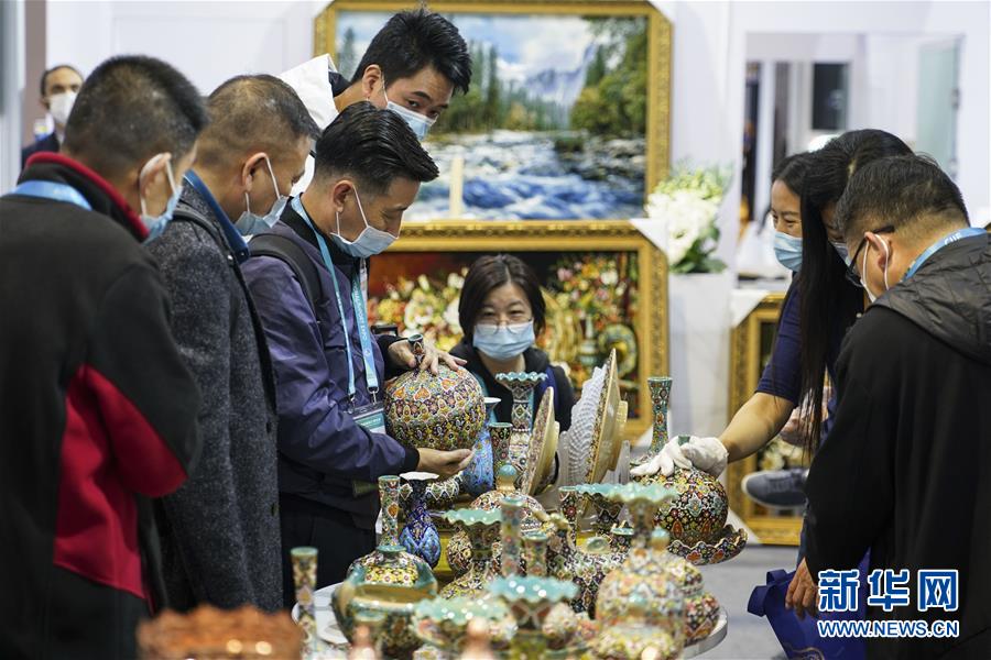 11月8日,观众在进博会消费品展区参观伊朗手工艺品。 第三届中国国际进口博览会上中外文化汇聚,这一全球贸易盛会同时成为了文化交流平台。 新华社记者 张豪夫 摄