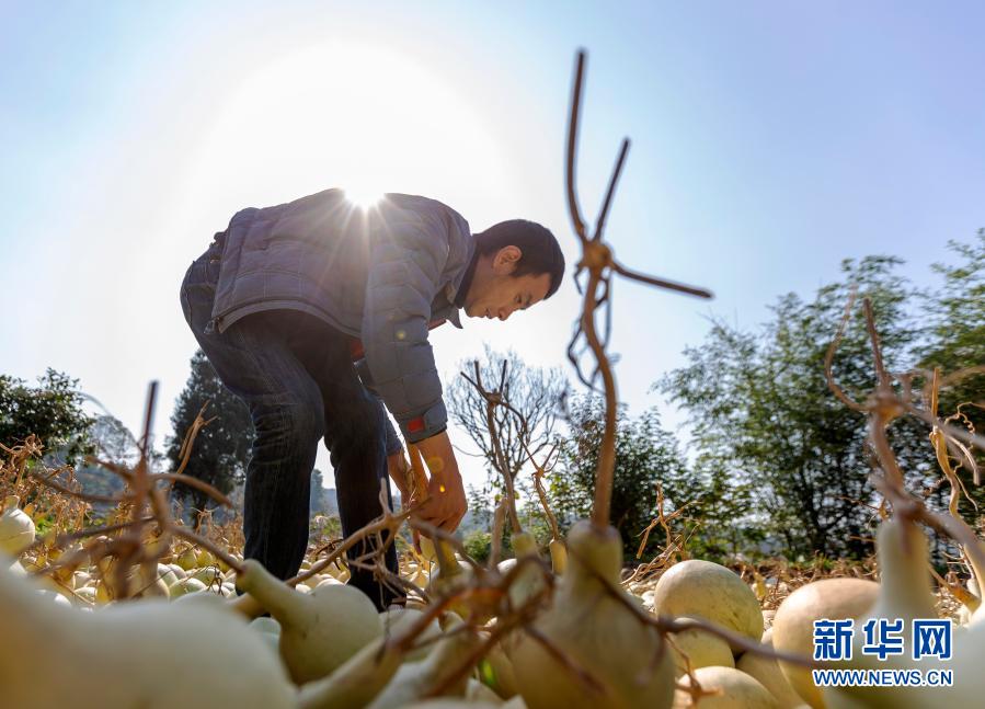 11月12日,毕节市黔西县杜鹃街道岔白社区村民在翻晒葫芦。新华社发(范晖 摄)
