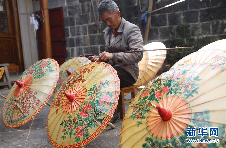 11月17日,荥阳村的纸伞艺人在制作油纸伞。 云南省腾冲市固东镇荥阳村有着上百年制作油纸伞的历史,但机制雨伞的出现和其价格优势,让手工制作的油纸伞市场越来越小。近年来,随着当地旅游业的兴起,样式别致、图案精美的油纸伞作为工艺品受到游客青睐,传承百年的油纸伞焕发了新的生机。 新华社发(梁志强 摄)