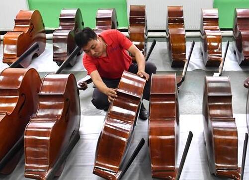 工人在河南驻马店市确山县提琴产业园提琴生产车间打磨琴头。