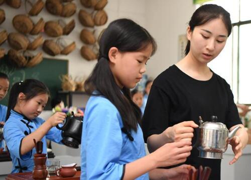 为培养学生的文化底蕴和实践能力,沩山乡九年制学校自2012年起面向三至六年级的学生开办茶艺班,学生可自愿报名,每周上一节茶艺课。