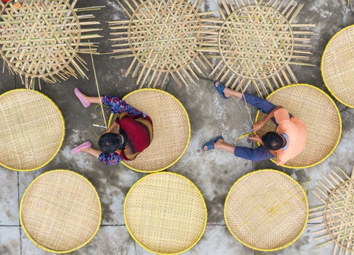 2020年7月14日,海安市曲塘镇大陈庄村的几位老篾匠在农家院子里制作竹编制品。