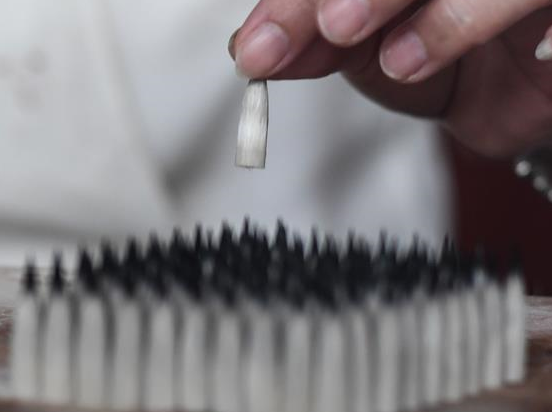 6月17日,湖州市善琏湖笔厂的技师在择笔车间教授小朋友完成择笔工序。浙江省湖州市南浔区善琏镇是中国湖笔的故乡。
