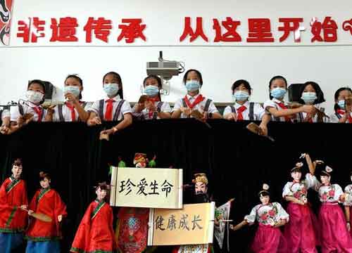 福建省连城县城乡小学学生将提线木偶、雕版印刷及传统花灯等当地客家非遗文化元素,融入校园禁毒宣传活动中,提高防毒、拒毒和禁毒意识。.