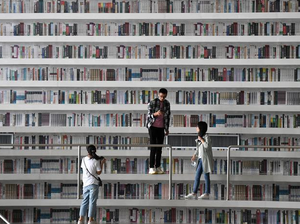 一名读者站在北京市西城区模范书局·诗空间的书架前。