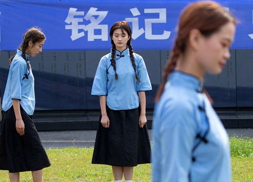 学生、老战士、军人等各界代表出席在沈阳九一八历史博物馆残历碑前举行的“勿忘九一八”撞钟鸣警仪式,以铭记历史,缅怀先烈。