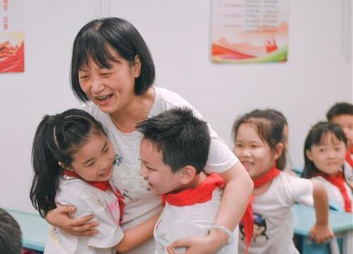 在福州市乌山小学,二年级学生在《老师,让我抱抱您》主题班会上拥抱老师。