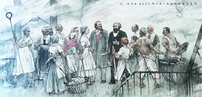 “马克思题材绘画作品创作”是美术界为纪念马克思诞辰200周年而推出的一项重量级献礼活动。此项活动由中央编译局、中国文联主办,中宣部理论局和文艺局参与,中国美协承办。活动围绕马克思生平的重大历史事件和重要人生节点,请各地美术家以油画和国画为表现形式创作了24幅马克思题材作品。在今年年初举行的“马克思题材绘画作品创作工作会”上,中央编译局的专家和北京大学、南京大学的教授也参与其中。在创作过程中,中国文联、中国美协的领导和马克思研究专家还走进部分美术家的工作室进行观摩指导。根据中国美协提供的作品名录来看,从《马克思童年时代的特里尔城》到《写作〈共产党宣言〉》,从《在伦敦德意志工人教育协会作报告》到《〈资本论〉在工人之间传播》,从《在国际工人协会(第一国际)成立大会上》到《满腔热情支持巴黎公社》,从《晚年关注俄国和东方经济落后国家的发展道路》到《延安时期学习马克思主义蔚然成风》,24幅作品基本上按照时间脉络排列,其中群像型作品占比较大。冯远的中国画《在国际工人协会成立大会上》呈现出一种蒸腾的动感,现场气氛令人激动,工人们将帽子抛向了空中,这是一种多少文字也写不出的热烈场面,让人真正感受到了美术的力量。刘大为的中国画《马克思、恩格斯与工人代表们在一起》描绘了马克思、恩格斯到工厂考察调研的情景,领袖和工人打成一片,让人读出了思想与劳动结合在一起的神圣。苏州科技大学传媒与视觉艺术学院的王嫩教授是江苏唯一受邀参加“马克思题材绘画作品创作”的艺术家,因而受到了当地新闻媒体的广泛关注。据《姑苏晚报》等媒体报道,今年1月5日,王嫩受邀赴京选定题目《终身伴侣》,回苏州后一个月闭门创作初稿,2月5日再赴京接受中央编译局专家审稿“挑刺”,通过审核后即赶回苏州加班加点,连大年初一都在进行创作。上个月中央电视台《不朽的马克思》专题片摄制组曾前往苏州王嫩工作室进行现场采访,北京电视台亦专程赴苏跟踪拍摄创作进程。