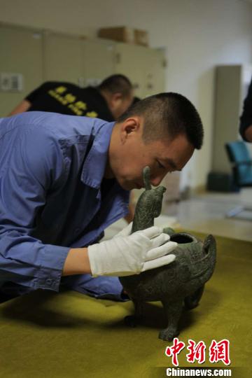 中新网太原5月9日电 (李庭耀 胡健)9日,在参加了为期10天的北京大学120周年校庆特展《寻真——北京大学考古教学与科研成果展》后,被誉为山西博物院“镇馆之宝”的晋侯鸟尊平安返回太原市,此次随晋侯鸟尊返回的还有其尾部象鼻本身残缺的残件。