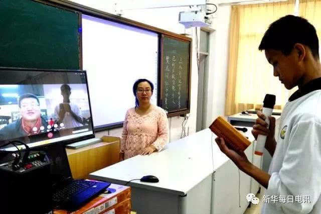 2017年5月26日,北京市大葆台西汉墓博物馆和海南省昌江黎族自治县思源实验学校举办了远程教学活动。图为思源实验学校的符小慧老师同博物馆的指导教师一起进行视频远程视频教学。