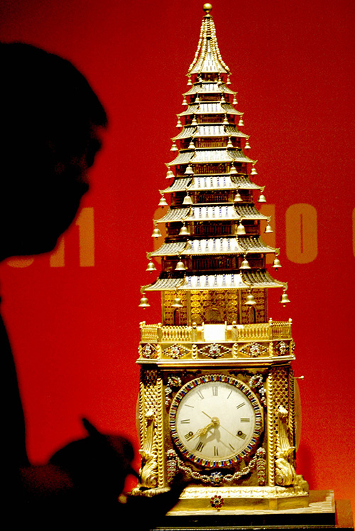 这是铜镀金嵌料石升降塔钟。塔座上立九层六角塔,每层均饰栏板,塔檐有六条珠链。弦满开动后,随着中国民乐《茉莉花》的旋律,塔身缓缓升起,而后又平稳降落,曲终,塔恢复原状。
