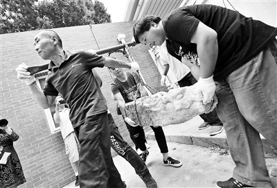 在昨天的文物搬运现场,两位工人挑担子,两位工人用手托住龙头两边,四人费了好大劲才将螭头搬到车上,开启“回家”之路。待螭头到达圆明园后,将有专家对它们进行全身“体检”,制定修复方案。“这些螭头有一些小裂缝,如果不好好保护,时间久了容易出问题。”圆明园文物考古科科长陈辉说。摄影/本报记者 袁艺