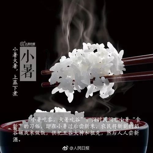 旧时有小暑“食新”迎丰收的习俗,小暑过后,农民将新割的稻谷碾成米做好饭后,供祀五谷大神和祖先;还可以买少量新米与老米同煮,再搭配新上市的蔬菜。