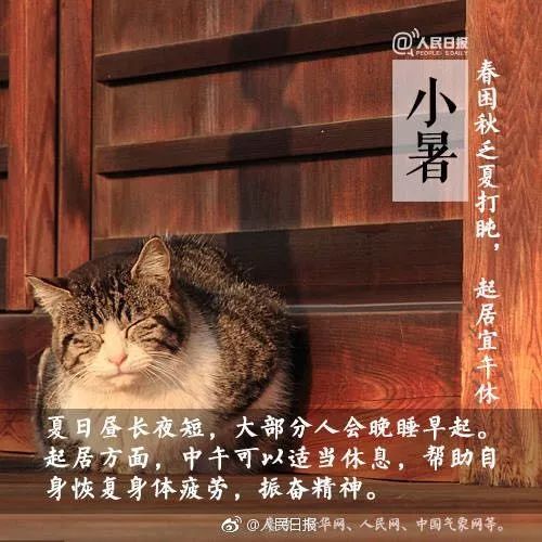 小暑时人体阳气旺盛,阳气具有护卫体表、抵御外邪的功能。只有保护好自身的阳气,人体才得以健康无恙。小暑时气候炎热,人体能量消耗较大,此时宜遵循“少动多静”的养生原则,以免阳气外泄太过。每天作息应有规律,除了要保证充足的睡眠外,也要注意劳逸结合,运动时一定要掌握好强度,避免强度过大。