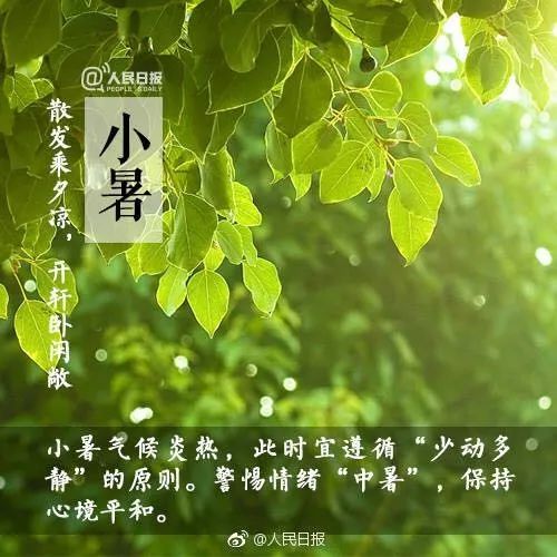 “小暑接大暑、热得无处躲”。伴随着阵阵热浪,7月7日(周六)我们将迎来今年的“小暑”节气。小暑,是炎热的开始。谚语说:“小暑过,每日热三分”,各地逐渐进入全年气温最高期,“三伏天”的序幕徐徐拉开,正如韩愈所说:“如坐深甑(zèng)遭蒸炊”。小暑是人体阳气最旺盛的时候,盛夏时节,养生要先“静心”。还有什么需要注意的?快来读一读~~