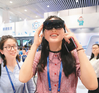 5月19日,参观者在北京科技周上体验国际上首款量产版全高清AR智能眼镜。