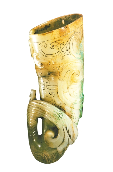角形玉杯,用一整块青玉雕琢而成,青白色,玉质上佳,温润致密,呈半透明状,口缘微损。玉杯应是酒器,呈犀牛角造型,口椭圆,腹中空。相传犀牛角的酒杯可以溶解毒物,玉虽不能解毒,但玉匠却借题发挥,匠心独运,它表明这一时期玉雕在章法布局、材料运用、技巧发挥上走向成熟。