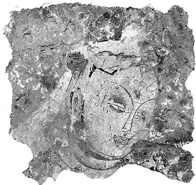 上述三件作品分别被安排在展览的第四、五、七单元,还有一件作品则被放在了整个展览的结束之处——这是一件曾被误认为来自敦煌,实际上来自克孜尔的待命名作品。画中的人物头生五髻,瞠目怒眉,耳饰硕大,具有典型异域特征。依据“五髻”等主要特征,日本秋田公立美术大学井上豪教授推测其为乾达婆(佛教中以音乐和香气等缥缈之物供养佛祖的神),早稻田大学的山部能宜教授则认为其为与乾达婆相似的另一尊神明。亦有观点依据《长阿含经》卷五中“大梵王即化为童子,头五角”的记述,结合其他同类壁画中五髻形象一般出现在与其他任务相比较低的位置,对其身躯的描绘也较为矮小的特点,推测画中人物为童子。因此,该人物的身份目前尚存争议,作品名称也只能暂定为《五髻乾达婆(?)五髻童子(?)》。