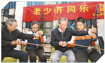 10月13日,安徽省合肥市第三十八中学和平校区学生走进全椒路社区,与社区老人一起,感受民族器乐,学习黄梅戏曲,老少同乐庆重阳。傅 军摄(人民视觉)