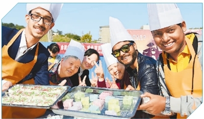 10月12日,江苏科技大学留学生来到镇江市金山街道黑桥社区,为空巢老人制作重阳糕。石玉成摄(人民视觉)
