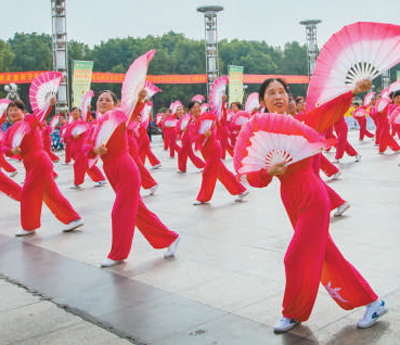江西南昌县澄碧湖广场,老年健身队在表演广场舞,尽显飒爽英姿。